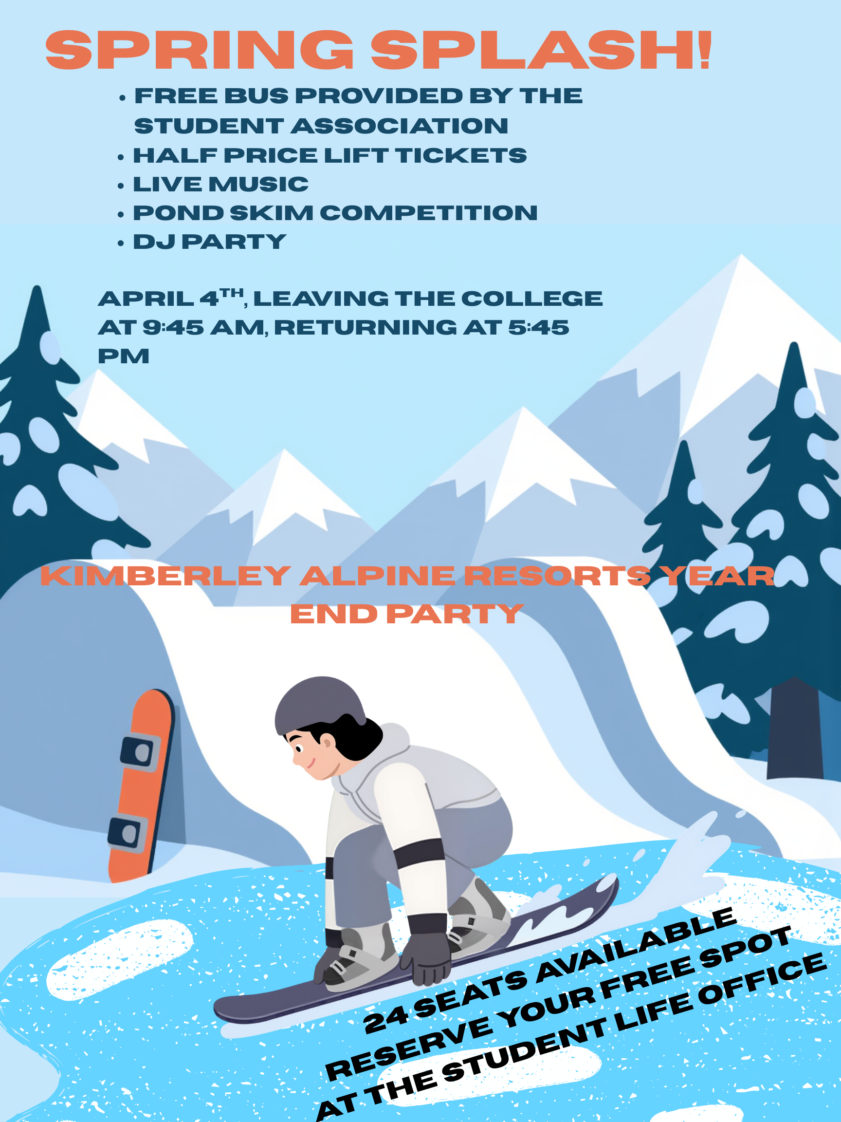 Free Bus Provided by the Student Association Half Price Lift Tickets Live Music Pond Skim Competition DJ party April 4th, Leaving the College at 9:45 AM, returning at 5:45 PM