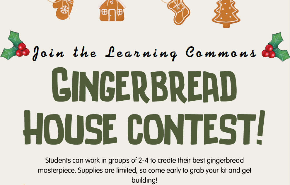 Take a break from your studies to create your best gingerbread masterpiece in groups of 2-4! Supplies are limited, so come early to grab your kit and get building. Prizes will be awarded to the winning house.