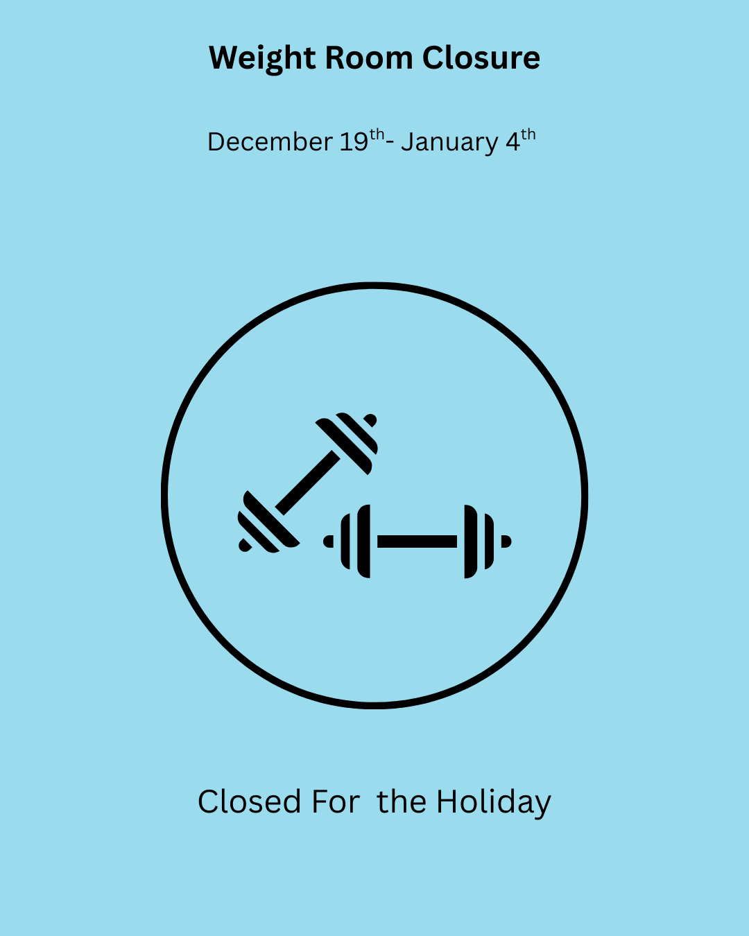 Holiday Closure – The Gym and Weight Room are closed December 19 – January 4. Happy Holidays! See you in 2026!